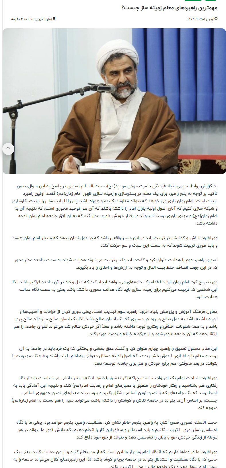 حجت الاسلام نصوری در پاسخ به این سوال، ضمن تاکید بر توجه به پنج راهبرد برای یک معلم در بسترسازی و زمینه سازی ظهور امام زمان(عج) گفت: اولین راهبرد تربیت است، امام زمان یاری می خواهد که بتواند معاونت کننده و همراه باشد، پس لذا باید نسلی را تربیت، کارسازی و شبکه سازی کنیم که آنان اصول اولیه یاران امام را داشته باشند که آن هم توحید محوری است، که نتیجه آن به امام زمان(عج) و مهدی باوری برسد، تا بتواند در رفتار خویش طوری عمل کند که به آن افق جامعه امام زمان توجه داشته باشد.