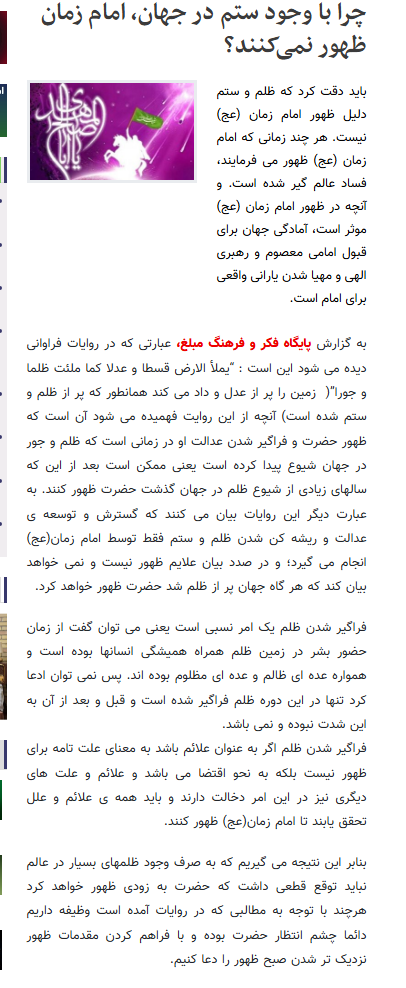 باید دقت کرد که ظلم و ستم دلیل ظهور امام زمان (عج) نیست. هر چند زمانی که امام زمان (عج) ظهور می فرمایند، فساد عالم گیر شده است. و آنچه در ظهور امام زمان (عج) موثر است، آمادگی جهان برای قبول امامی معصوم و رهبری الهی و مهیا شدن یارانی واقعی برای امام است.