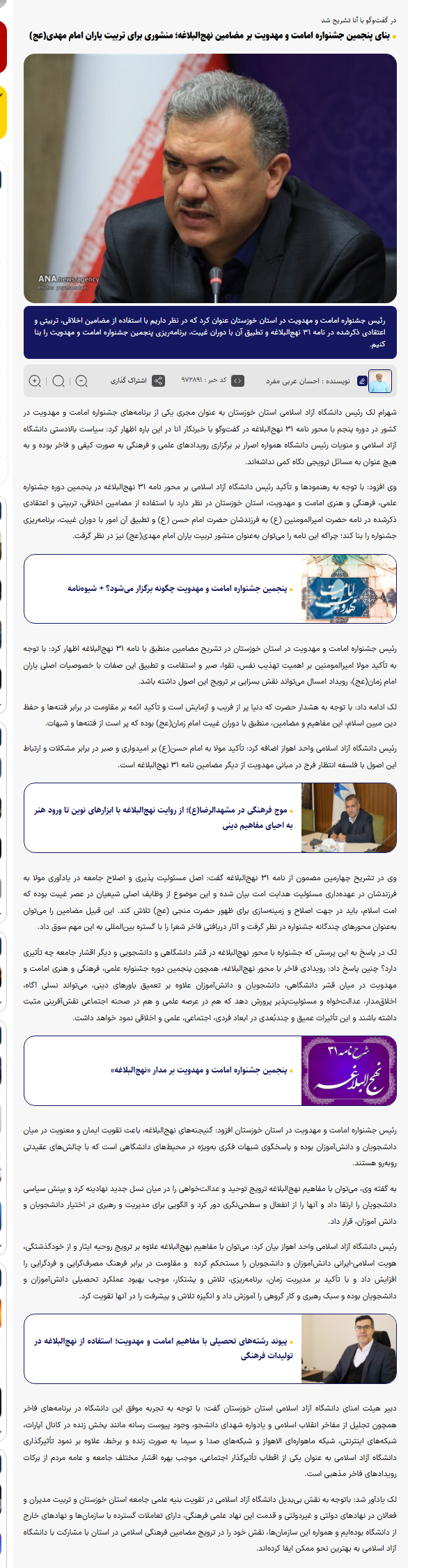 وی افزود: با توجه به رهنمودها و تأکید رئیس دانشگاه آزاد اسلامی بر محور نامه ۳۱ نهجالبلاغه در پنجمین دوره جشنواره علمی، فرهنگی و هنری امامت و مهدویت، استان خوزستان در نظر دارد با استفاده از مضامین اخلاقی، تربیتی و اعتقادی ذکرشده در نامه حضرت امیرالمومنین (ع) به فرزندشان حضرت امام حسن (ع) و تطبیق آن امور با دوران غیبت، برنامهریزی جشنواره را بنا کند؛ چراکه این نامه را میتوان بهعنوان منشور تربیت یاران امام مهدی(عج) نیز در نظر گرفت.