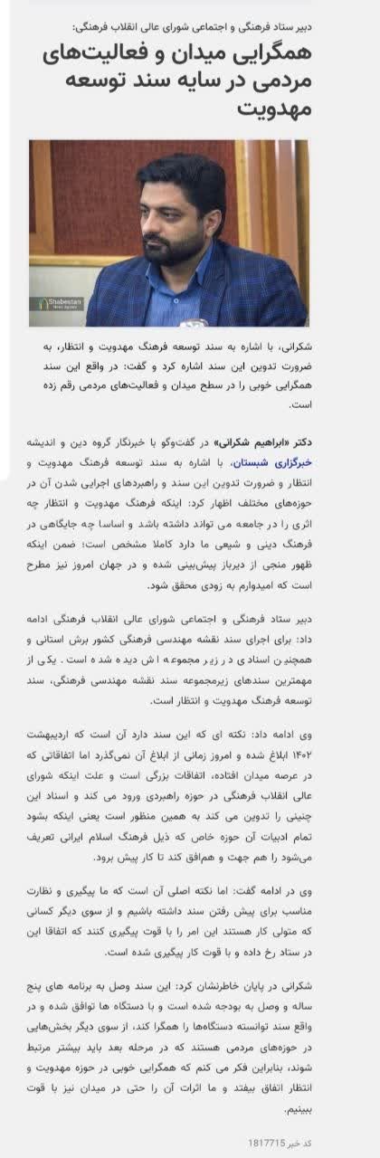 شکرانی، با اشاره به سند توسعه فرهنگ مهدویت و انتظار، به ضرورت تدوین این سند اشاره کرد و گفت: در واقع این سند همگرایی خوبی را در سطح میدان و فعالیتهای مردمی رقم زده است.