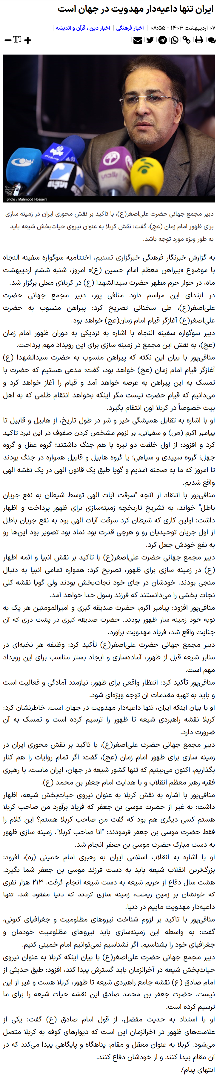 دبیر مجمع جهانی حضرت علیاصغر(ع)، با تاکید بر نقش محوری ایران در زمینه سازی برای ظهور امام زمان (عج)، گفت: اگر تمام روایات را هم کنار بگذاریم، اکنون میبینیم که تنها کشور شیعه در جهان، ایران ماست، با رهبری فقیه رهبر معظم انقلاب و با هدایت امام جعفر بن محمد (ع).