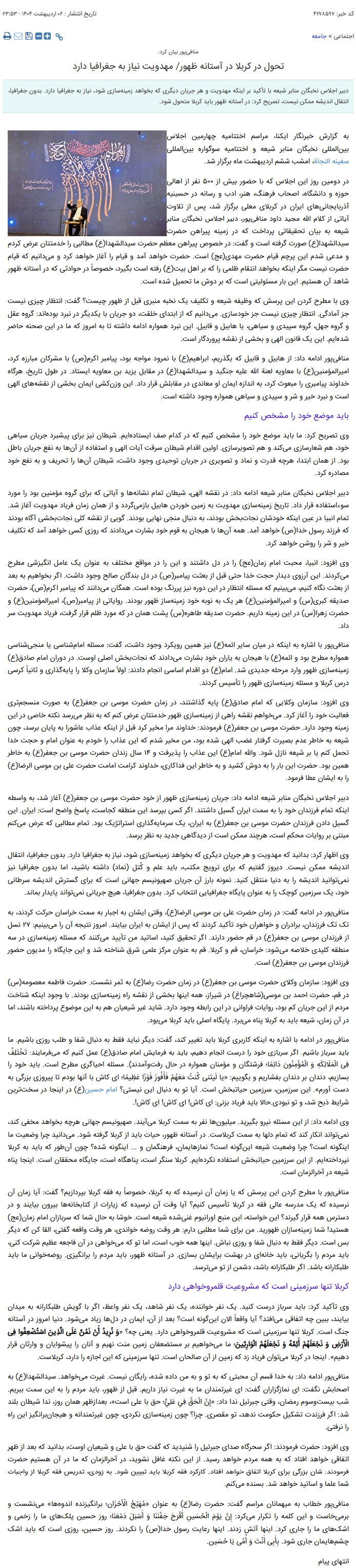 دبیر اجلاس نخبگان منابر شیعه با تأکید بر اینکه مهدویت و هر جریان دیگری که بخواهد زمینهسازی شود، نیاز به جغرافیا دارد. بدون جغرافیا، انتقال اندیشه ممکن نیست، تصریح کرد: در آستانه ظهور باید کربلا متحول شود.