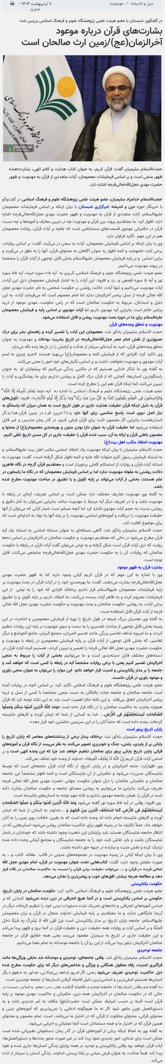 عضو هیئت علمی پژوهشگاه علوم و فرهنگ اسلامی تأکید کرد: بر اساس آنچه در روایات آمده است جامعه صالحان و جامعه نجات یافتگان به دست منجی مشخصا با کسی از نسل و ذریه پیامبر آخرالزمان اتفاق میافتد و این نکته حائز اهمیت است باید به این نکته توجه کرد که قرآن همواره بشارت به حاکمیت صالحان را در نگاه قرار داده است «وَعَدَ اللَّهُ الَّذِینَ آمَنُوا مِنکُمْ وَعَمِلُوا الصَّالِحَاتِ لَیَسْتَخْلِفَنَّهُمْ فِی الْأَرْضِ... خدا به کسانی از شما که ایمان آورده و کارهای شایسته کردهاند، وعده داده است که حتماً آنان را در این سرزمین جانشین خود قرار دهد».