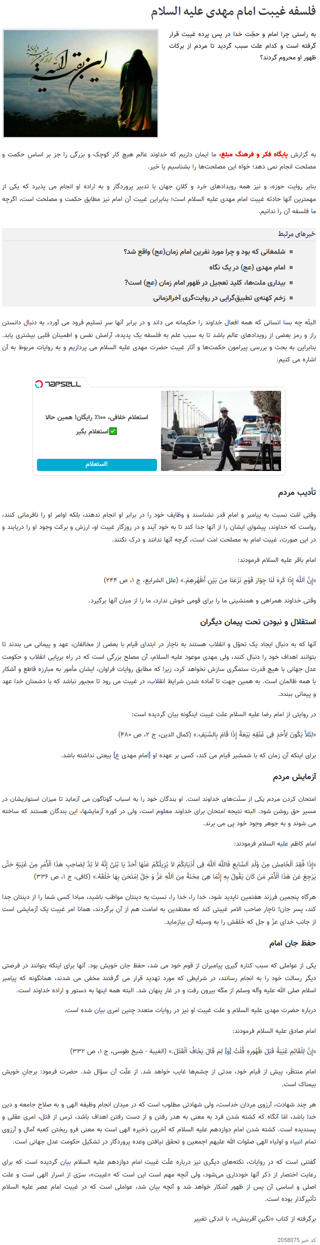 در روایتی از امام رضا علیه السلام علت غیبت اینگونه بیان گردیده است: