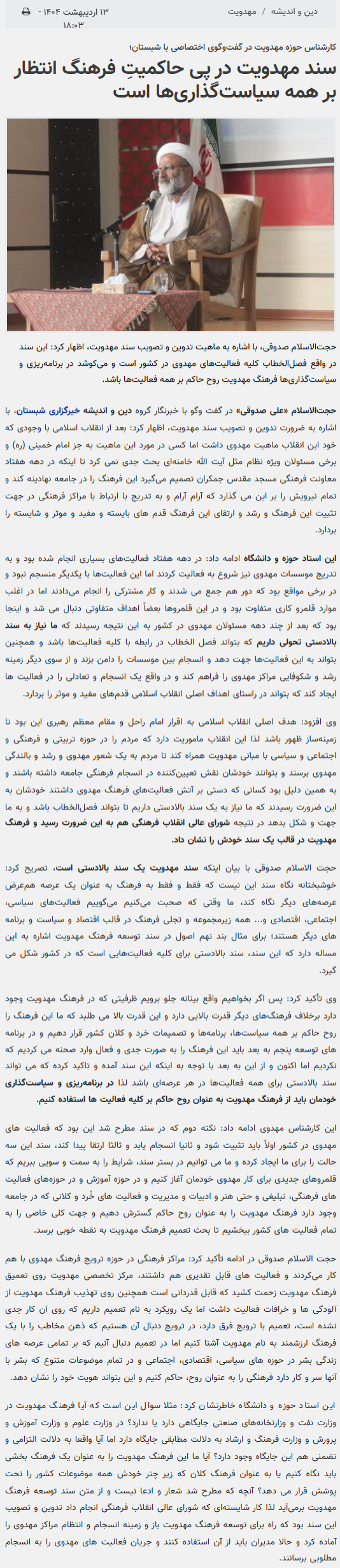 حجتالاسلام صدوقی، با اشاره به ماهیت تدوین و تصویب سند مهدویت، اظهار کرد: این سند در واقع فصلالخطاب کلیه فعالیتهای مهدوی در کشور است و میکوشد در برنامهریزی و سیاستگذاریها فرهنگ مهدویت روح حاکم بر همه فعالیتها باشد.