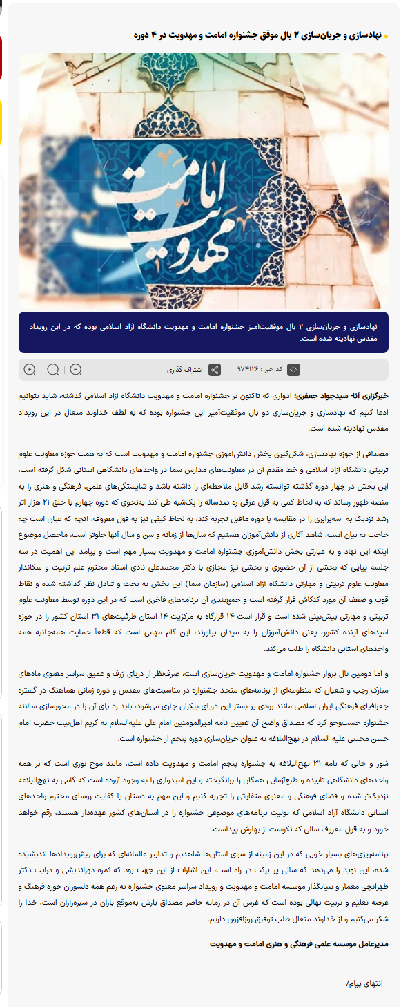 نهادسازی و جریانسازی ۲ بال موفقیتآمیز جشنواره امامت و مهدویت دانشگاه آزاد اسلامی بوده که در این رویداد مقدس نهادینه شده است.