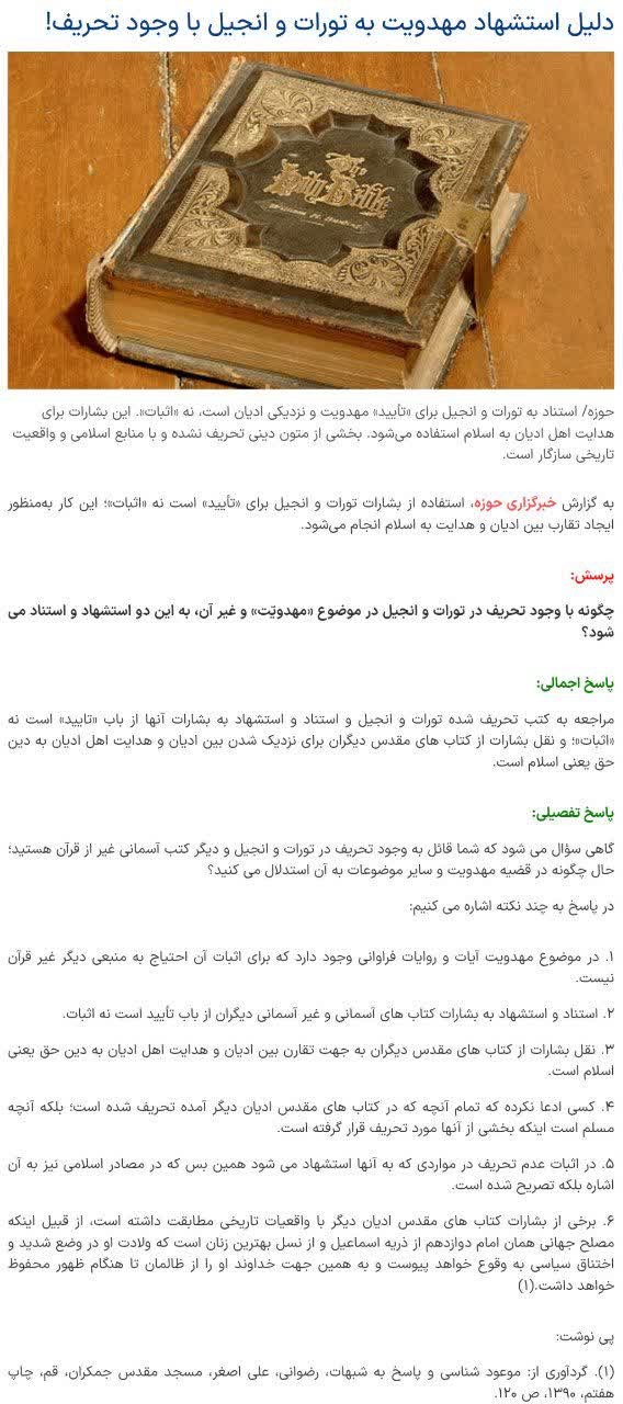 گاهی سؤال می شود که شما قائل به وجود تحریف در تورات و انجیل و دیگر کتب آسمانی غیر از قرآن هستید؛ حال چگونه در قضیه مهدویت و سایر موضوعات به آن استدلال می کنید؟
