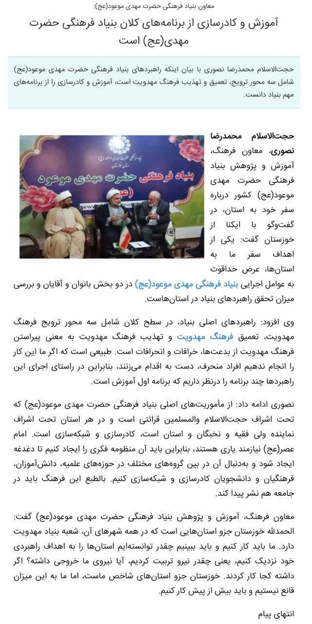 معاون فرهنگ، آموزش و پژوهش بنیاد فرهنگی حضرت مهدی موعود(عج) گفت: الحمدلله خوزستان جزو استانهایی است که در همه شهرهای آن، شعبه بنیاد مهدویت دارد. ما باید کار کنیم و باید ببینیم چقدر توانستهایم استانها را به اهداف راهبردی خود نزدیک کنیم، یعنی چقدر نیرو تربیت کردیم، آیا نیروی ما خروجی داشته؟ اگر داشته کجا کار کردند. خوزستان جزو استانهای شاخص ماست، اما ما به این میزان قانع نیستیم و باید بیش از پیش کار کنیم.
