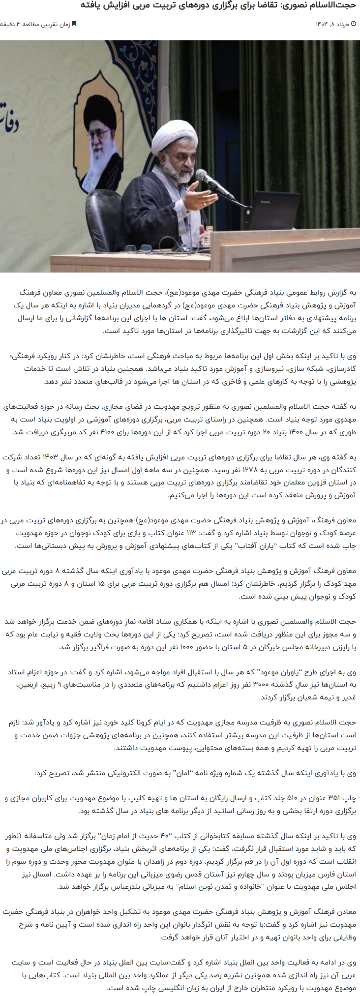 معاون فرهنگ، آموزش و پژوهش بنیاد فرهنگی حضرت مهدی موعود(عج) همچنین به برگزاری دورههای تربیت مربی در عرصه کودک و نوجوان توسط بنیاد اشاره کرد و گفت: ۱۱۳ عنوان کتاب و بازی برای کودک نوجوان در حوزه مهدویت چاپ شده است که کتاب “یاران آفتاب” یکی از کتابهای پیشنهادی آموزش و پرورش به پیش دبستانیها است.