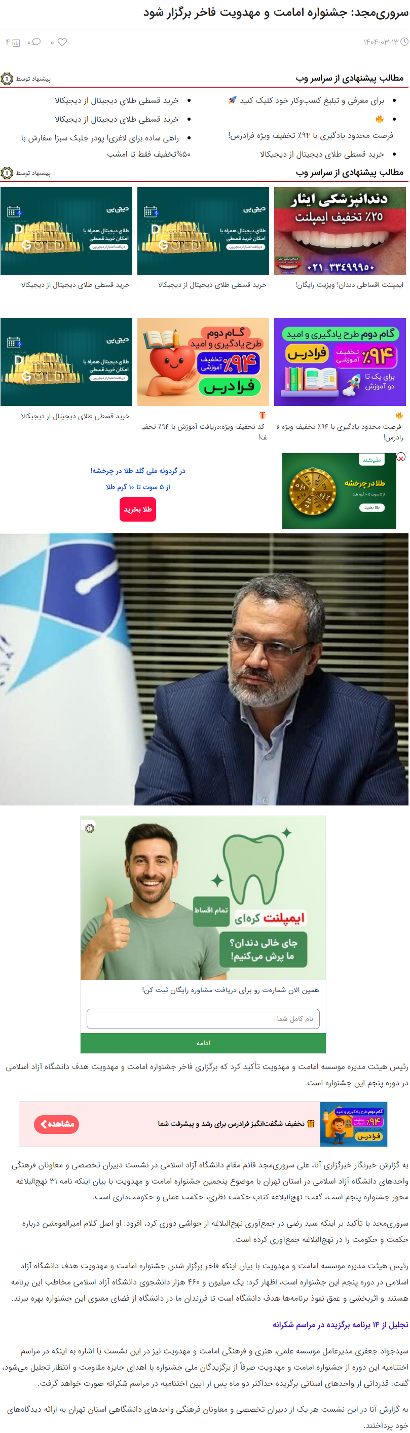 رئیس هیئت مدیره موسسه امامت و مهدویت با بیان اینکه فاخر برگزار شدن جشنواره امامت و مهدویت هدف دانشگاه آزاد اسلامی در دوره پنجم این جشنواره است، اظهار کرد: یک میلیون و ۴۶۰ هزار دانشجوی دانشگاه آزاد اسلامی مخاطب این برنامه هستند و اثربخشی و عمق نفوذ برنامهها هدف دانشگاه است تا فرزندان ما در دانشگاه از فضای معنوی این جشنواره بهره ببرند.