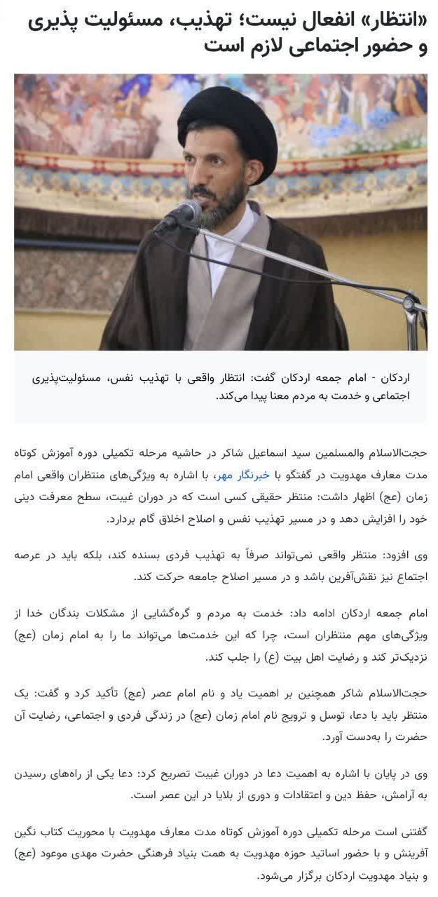 امام جمعه اردکان گفت: انتظار واقعی با تهذیب نفس، مسئولیتپذیری اجتماعی و خدمت به مردم معنا پیدا میکند.