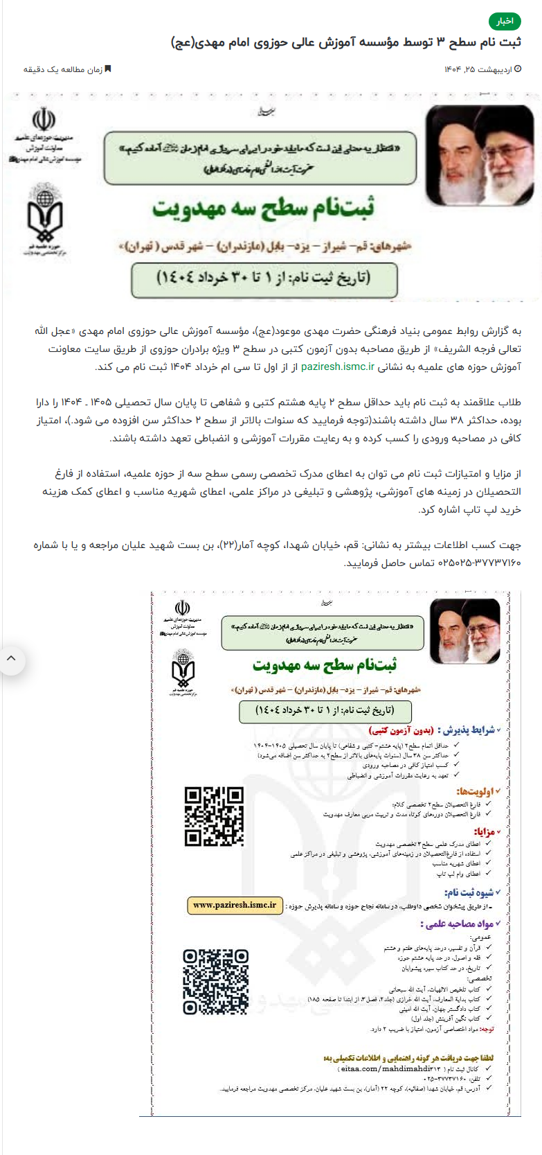مؤسسه آموزش عالی حوزوی امام مهدی «عجل الله تعالی فرجه الشریف» از طریق مصاحبه بدون آزمون کتبی در سطح ۳ ویژه برادران حوزوی از طریق سایت معاونت آموزش حوزه های علمیه به نشانی paziresh.ismc.ir از از اول تا سی ام خرداد ۱۴۰۴ ثبت نام می کند.