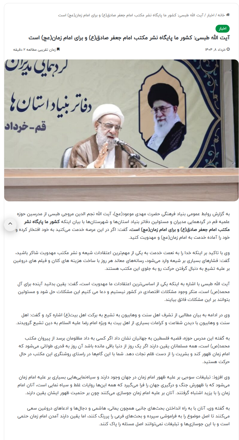 آیت الله نجم الدین مروجی طبسی از مدرسین حوزه علمیه قم در گردهمایی مدیران و مسئولین دفاتر بنیاد استانها و شهرستانها با بیان اینکه کشور ما پایگاه نشر مکتب امام جعفر صادق(ع) و برای امام زمان(عج) است، گفت: اگر در این عرصه خدمت میکنید به خود افتخار کرده و خود را آماده خدمت به امام زمان(عج) و مهدویت کنید.