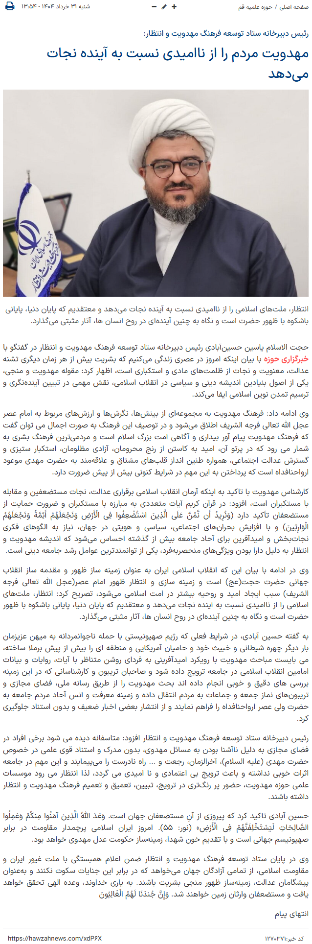 حجت الاسلام یاسین حسینآبادی رئیس دبیرخانه ستاد توسعه فرهنگ مهدویت و انتظار در گفتگو با خبرگزاری حوزه با بیان اینکه امروز در عصری زندگی میکنیم که بشریت بیش از هر زمان دیگری تشنه عدالت، معنویت و نجات از ظلمتهای مادی و استکباری است، اظهار کرد: مقوله مهدویت و منجی، یکی از اصول بنیادین اندیشه دینی و سیاسی در انقلاب اسلامی، نقش مهمی در تبیین آیندهنگری و ترسیم تمدن نوین اسلامی ایفا میکند.