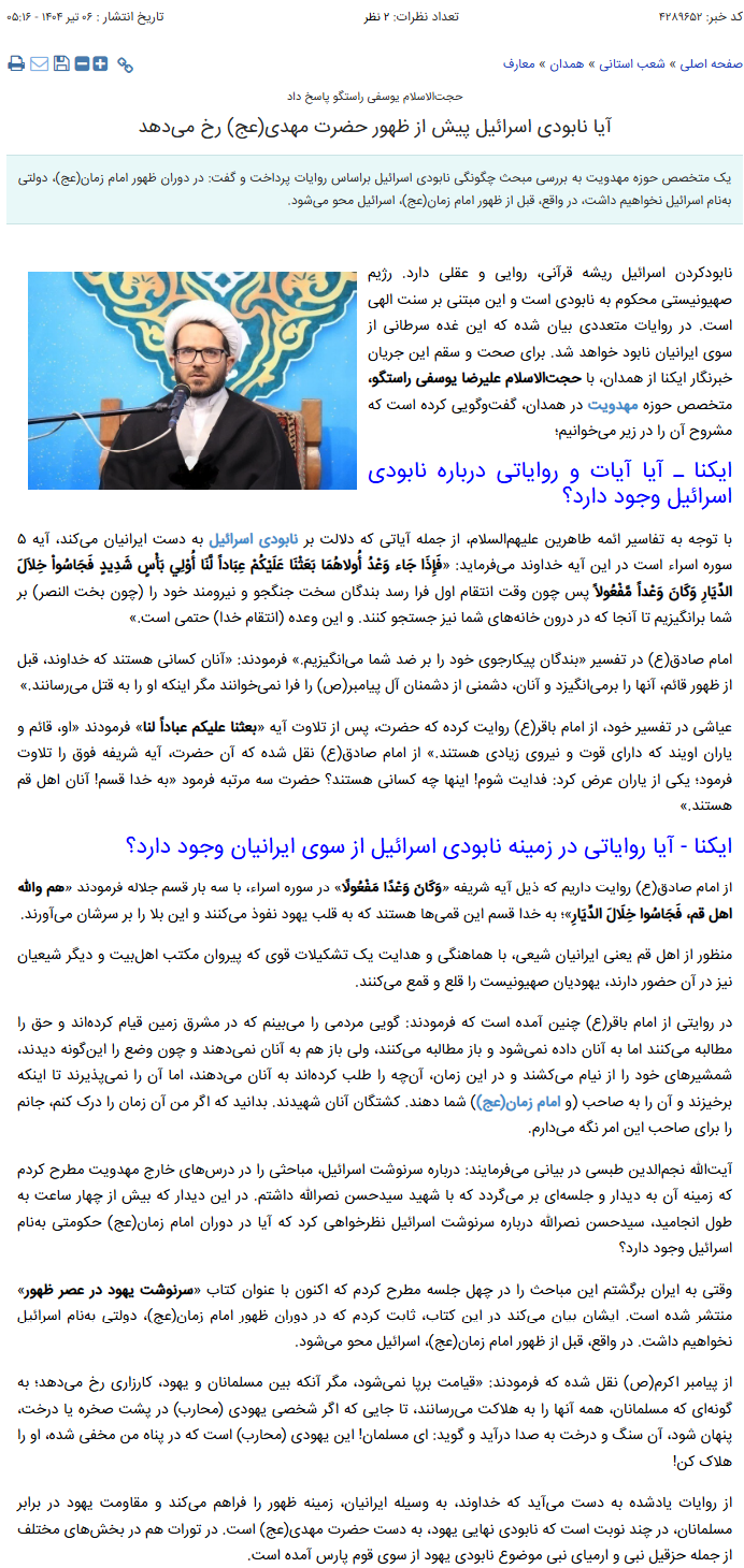 نابودکردن اسرائیل ریشه قرآنی، روایی و عقلی دارد. رژیم صهیونیستی محکوم به نابودی است و این مبتنی بر سنت الهی است. در روایات متعددی بیان شده که این غده سرطانی از سوی ایرانیان نابود خواهد شد. برای صحت و سقم این جریان خبرنگار ایکنا از همدان، با حجتالاسلام علیرضا یوسفی راستگو، متخصص حوزه مهدویت در همدان، گفتوگویی کرده است که مشروح آن را در زیر میخوانیم؛