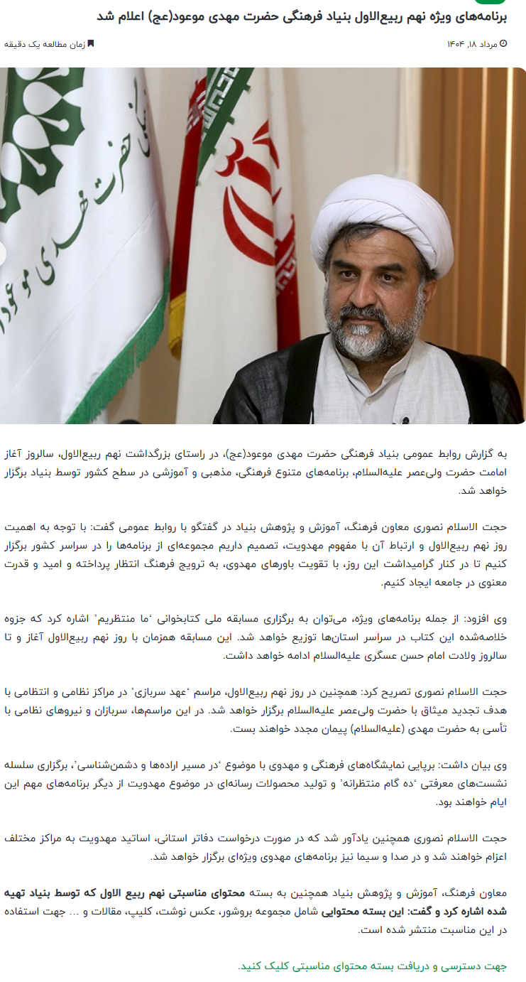 حجت الاسلام نصوری معاون فرهنگ، آموزش و پژوهش بنیاد در گفتگو با روابط عمومی گفت: با توجه به اهمیت روز نهم ربیعالاول و ارتباط آن با مفهوم مهدویت، تصمیم داریم مجموعهای از برنامهها را در سراسر کشور برگزار کنیم تا در کنار گرامیداشت این روز، با تقویت باورهای مهدوی، به ترویج فرهنگ انتظار پرداخته و امید و قدرت معنوی در جامعه ایجاد کنیم.