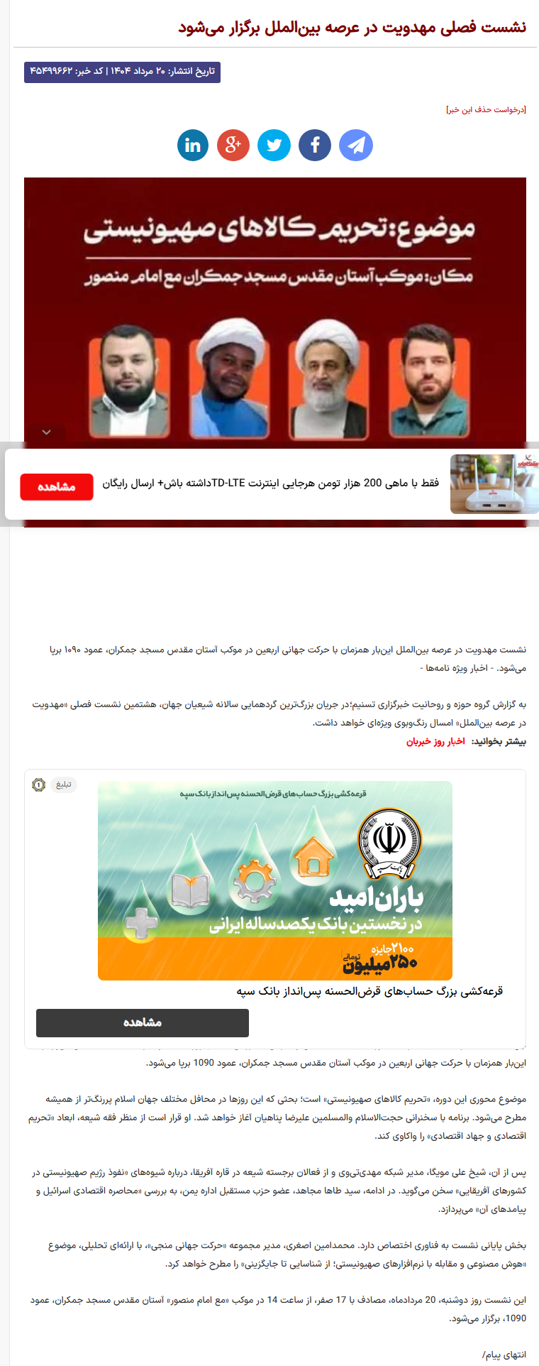 نشست مهدویت در عرصه بینالملل اینبار همزمان با حرکت جهانی اربعین در موکب آستان مقدس مسجد جمکران، عمود ۱۰۹۰ برپا میشود.
