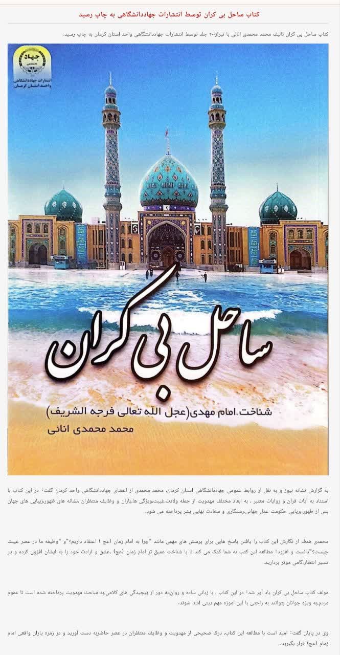 کتاب ساحل بی کران تالیف محمد محمدی انائی با تیراژ۲۰۰ جلد توسط انتشارات جهاددانشگاهی واحد استان کرمان به چاپ رسید.