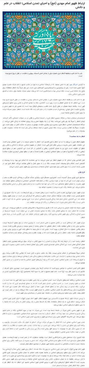 ظهور امام مهدی (عج) و احیای تمدن نوین اسلامی، دو روی یک سکه هستند. انتظار برای ظهور، زمانی معنا و اثربخشی پیدا میکند که با تلاش برای تحقق ارزشهای اسلامی در جامعه همراه باشد. اسلام، به عنوان مکتبی تمدنساز، طرح کاملی برای سعادت انسان در تمام ابعاد ارائه میدهد و باور به مهدویت، امید و انگیزه لازم برای پیادهسازی این طرح را در اختیار ما قرار میدهد. وظیفه ما به عنوان منتظران، تلاش برای خودسازی، اصلاح جامعه و زمینهسازی برای ظهور منجی عالم بشریت است تا شاهد تحقق آرمانهای بزرگ الهی و برپایی تمدنی نوین اسلامی باشیم. این انتظار، نه یک انتظار کور و منفعل، بلکه انتظار فعال، سازنده و مستمر است.