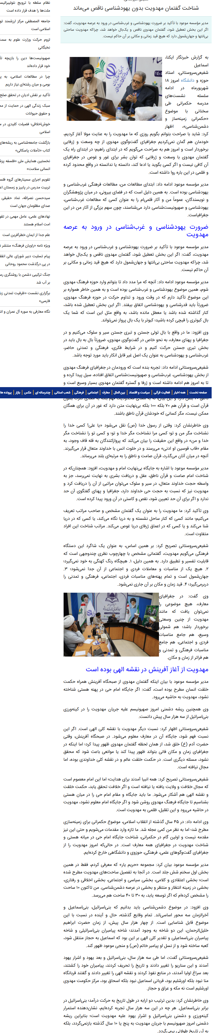 وی افزود: ما در واقع با بال تولی جستن و تبری جستن سیر و سلوک میکنیم و در جغرافیا و پهنای معارف، به نحو خاص در گفتوگوی مهدوی، ضرورتاً بال به بال باید در بخش تبری جستن حرکت کنیم و در شرایط فکری، فرهنگی و تمدنی حاضر، غربشناسی و یهودشناسی به عنوان یک اصل غیر قابل انکار باید مورد توجه باشد.