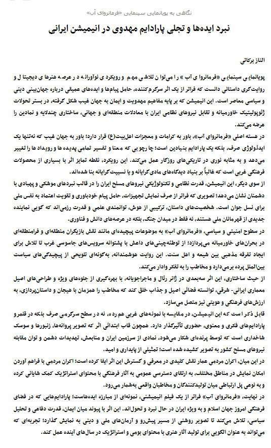 در نهایت، «فرمانروای آب» فراتر از یک فیلم انیمیشنی، نمونهای از مبارزه ایدههاست؛ پارادایمهایی که در فضای فرهنگی امروز جهان اسلام و به ویژه ایران در حال نبرد و تحولاند. این اثر با پیوند میان ایمان، قدرت دفاعی و تحلیل سیاسی، تلاش میکند تا تصویر روشنی از مسیر پیشرو و آرمانهای ملی و دینی به نمایش گذارد؛ تجربهای که میتواند به عنوان الگویی برای تولید آثار هنری با محتوای بومی و استراتژیک در سالهای آینده عمل کند.