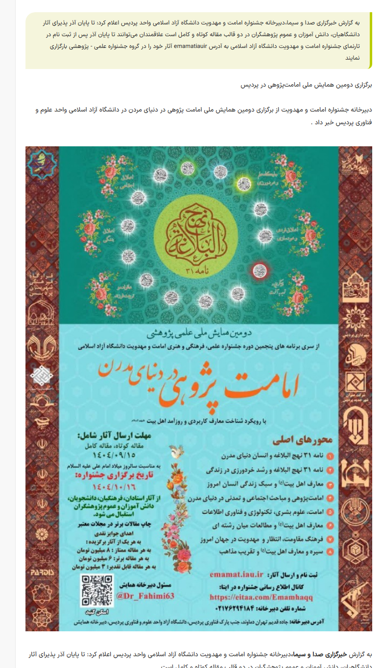 دبیرخانه جشنواره امامت و مهدویت دانشگاه آزاد اسلامی واحد پردیس اعلام کرد: تا پایان آذر پذیرای آثار دانشگاهیان، دانش آموزان و عموم پژوهشگران در دو قالب مقاله کوتاه و کامل است علاقمندان میتوانند تا پایان آذر پس از ثبت نام در تارنمای جشنواره امامت و مهدویت دانشگاه آزاد اسلامی به آدرس emamatiauir آثار خود را در گروه جشنواره علمی - پژوهشی بارگزاری نمایند.