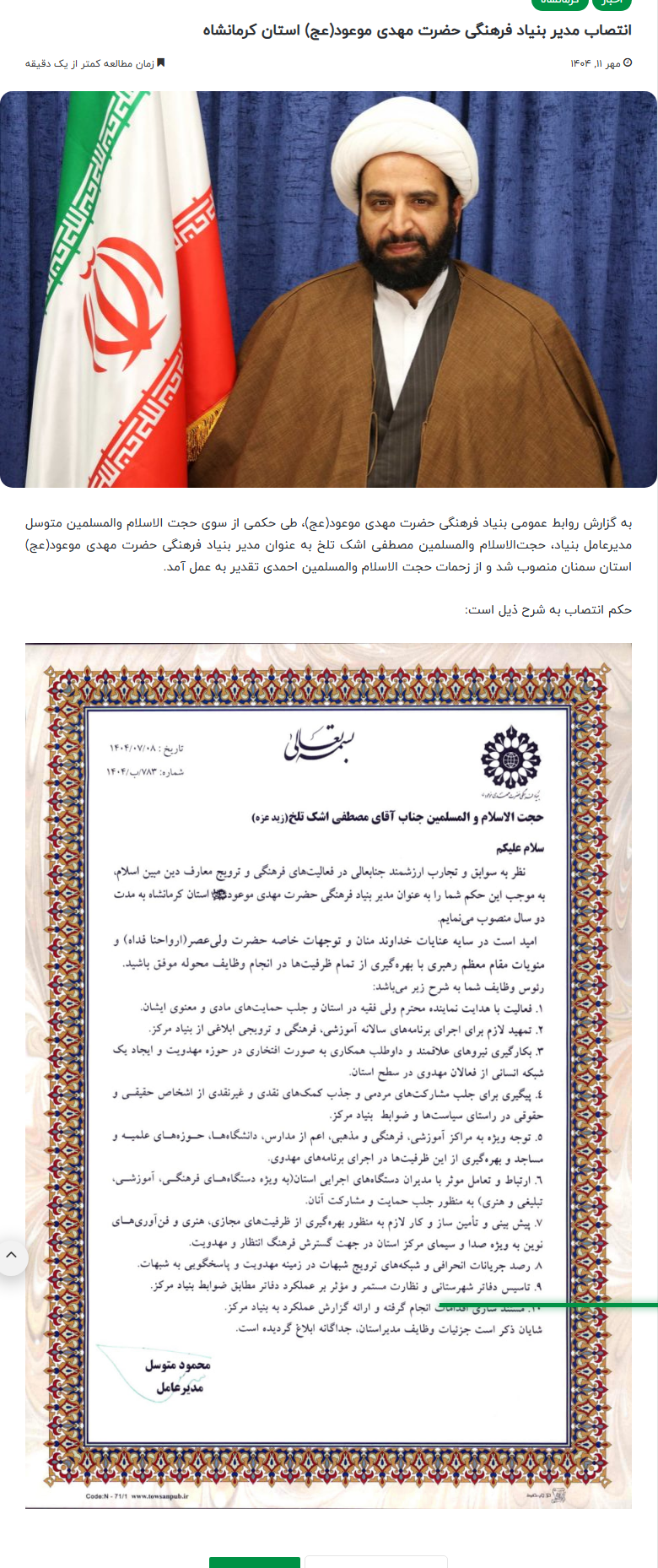 طی حکمی از سوی حجت الاسلام والمسلمین متوسل مدیرعامل بنیاد، حجتالاسلام والمسلمین مصطفی اشک تلخ به عنوان مدیر بنیاد فرهنگی حضرت مهدی موعود(عج) استان سمنان منصوب شد و از زحمات حجت الاسلام والمسلمین احمدی تقدیر به عمل آمد.