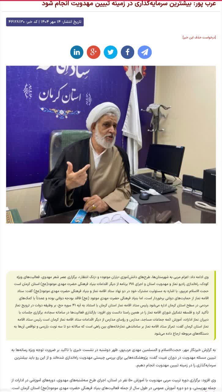 رئیس ستاد اقامه نماز استان کرمان با استناد به آیه ۴۱ سوره حج، بر وظیفه دولت در ترویج نماز تأکید کرد و فلسفه تشکیل شورای اقامه نماز را در همین راستا دانست.