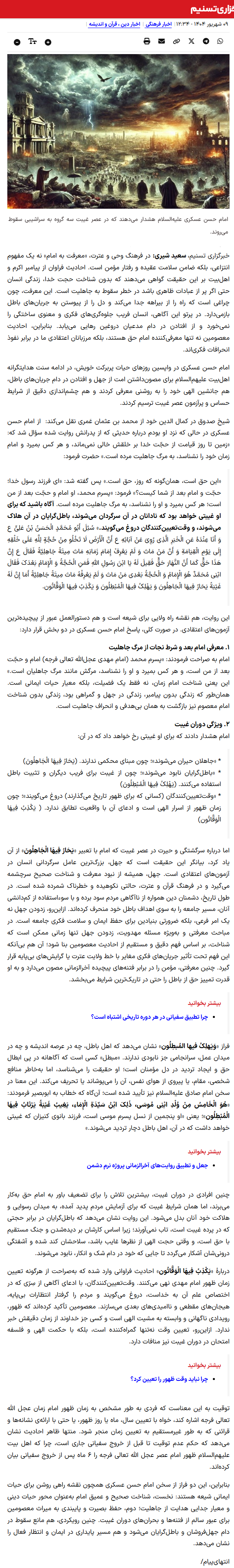 سعید شیری: در فرهنگ وحی و عترت، «معرفت به امام» نه یک مفهوم انتزاعی، بلکه ضامن سلامت عقیده و رفتار مؤمن است. احادیث فراوان از پیامبر اکرم و اهلبیت بر این حقیقت گواهی میدهند که بدون شناخت حجت خدا، زندگی انسان حتی اگر پر از عبادات ظاهری باشد در خطر سقوط به جاهلیت است. این معرفت، چون چراغی است که راه را از بیراهه جدا میکند و دل را از پیوستن به جریانهای باطل بازمیدارد. در پرتو این آگاهی، انسان فریب جلوهگریهای فکری و معنوی ساختگی را نمیخورد و از افتادن در دام مدعیان دروغین رهایی مییابد. بنابراین، احادیث معصومین نه تنها معرفیکننده امام حق هستند، بلکه مرزبانان اعتقادی ما در برابر نفوذ انحرافات فکریاند.
