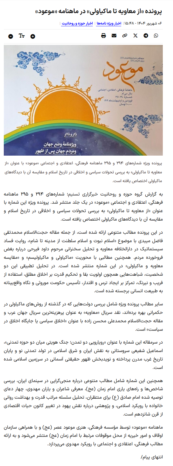 شمارههای 294 و 295 ماهنامه فرهنگی، اعتقادی و اجتماعی «موعود» در یک جلد منتشر شد. پرونده ویژه این شماره با عنوان «از معاویه تا ماکیاولی» به بررسی تحولات سیاسی و اخلاقی در تاریخ اسلام و مقایسه آن با دیدگاههای ماکیاولی اختصاص یافته است.