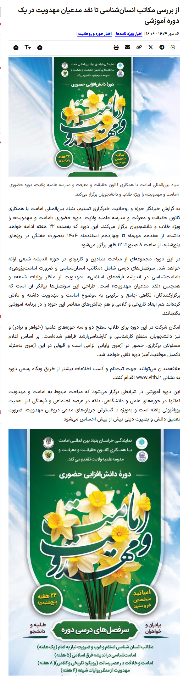 بنیاد بین‌المللی امامت با همکاری کانون حقیقت و معرفت و مدرسه علمیه ولایت، دوره حضوری «امامت و مهدویت» را ویژه طلاب و دانشجویان برگزار می‌کند.