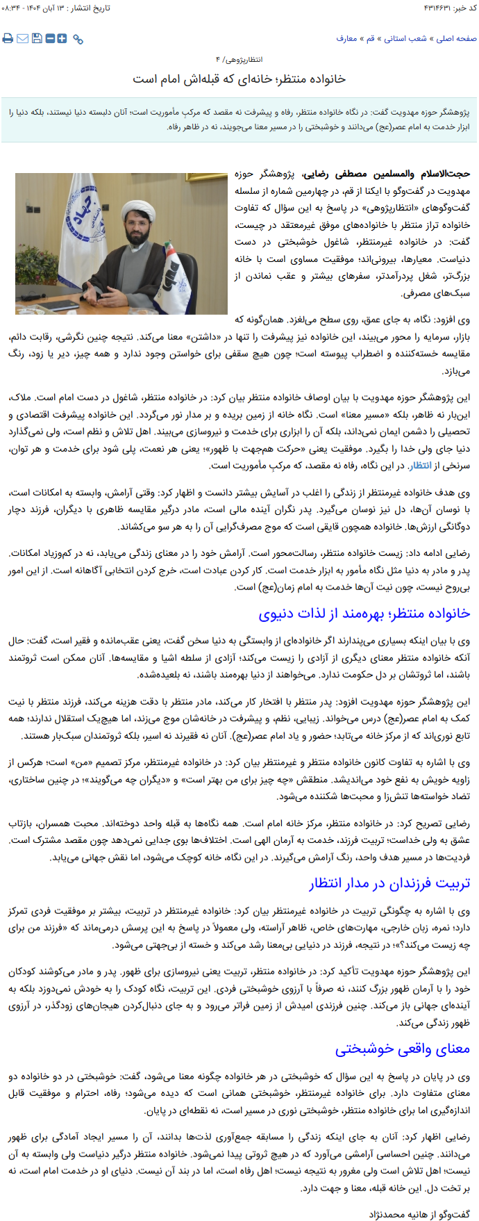 رضایی ادامه داد: زیست خانواده منتظر، رسالتمحور است. آرامش خود را در معنای زندگی مییابد، نه در کموزیاد امکانات. پدر و مادر به دنیا مثل نگاه مأمور به ابزار خدمت است. کار کردن عبادت است، خرج کردن انتخابی آگاهانه است. از این امور بیروح نیست، چون نیت آنها خدمت به امام زمان(عج) است.