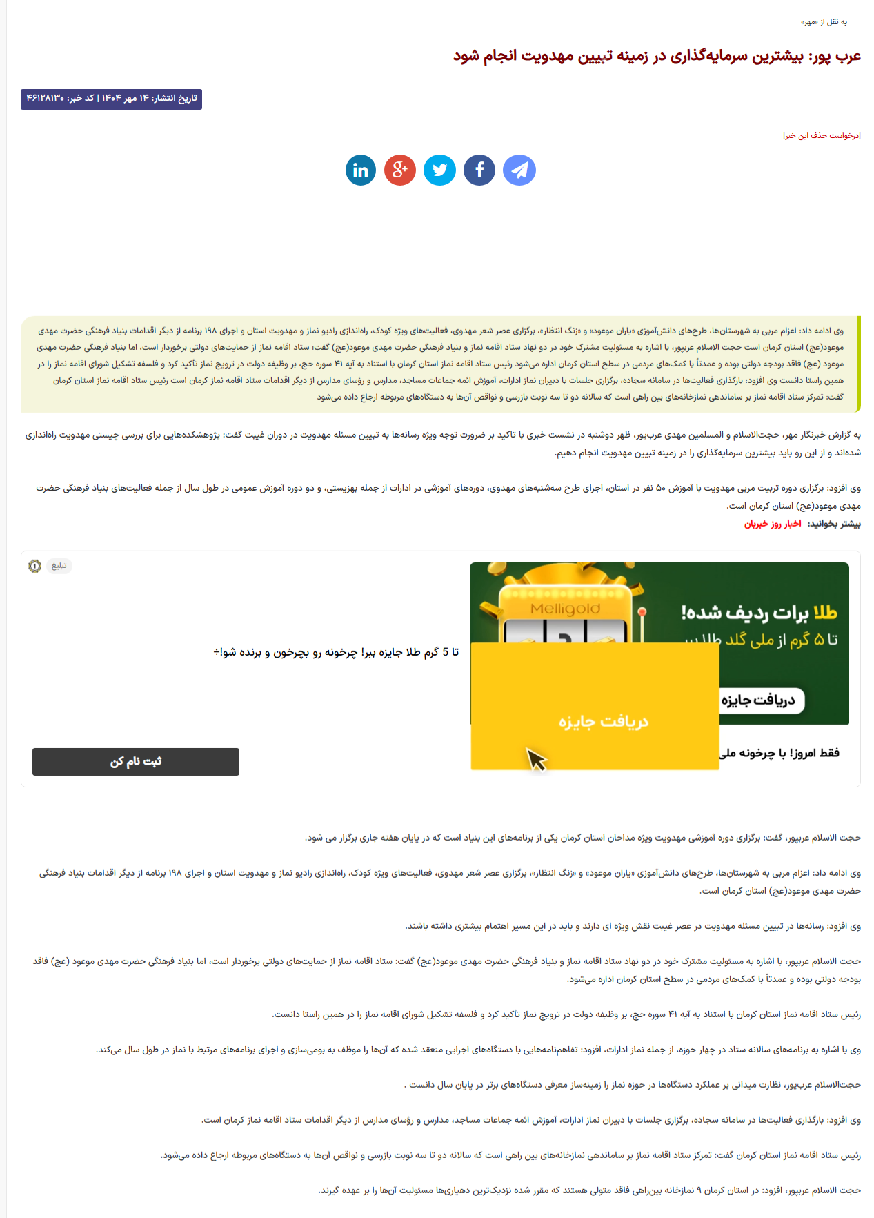 حجت الاسلام عربپور، با اشاره به مسئولیت مشترک خود در دو نهاد ستاد اقامه نماز و بنیاد فرهنگی حضرت مهدی موعود(عج) گفت: ستاد اقامه نماز از حمایتهای دولتی برخوردار است، اما بنیاد فرهنگی حضرت مهدی موعود (عج) فاقد بودجه دولتی بوده و عمدتاً با کمکهای مردمی در سطح استان کرمان اداره میشود.