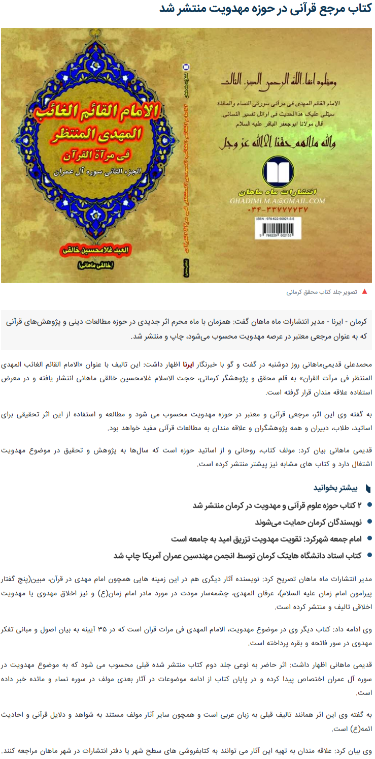 محمدعلی قدیمیماهانی روز دوشنبه در گفت و گو با خبرنگار ایرنا اظهار داشت: این تالیف با عنوان «الامام القائم الغائب المهدی المنتظر فی مرآت القران» به قلم محقق و پژوهشگر کرمانی، حجت الاسلام غلامحسین خالقی ماهانی انتشار یافته و در معرض استفاده علاقه مندان قرار گرفته است.