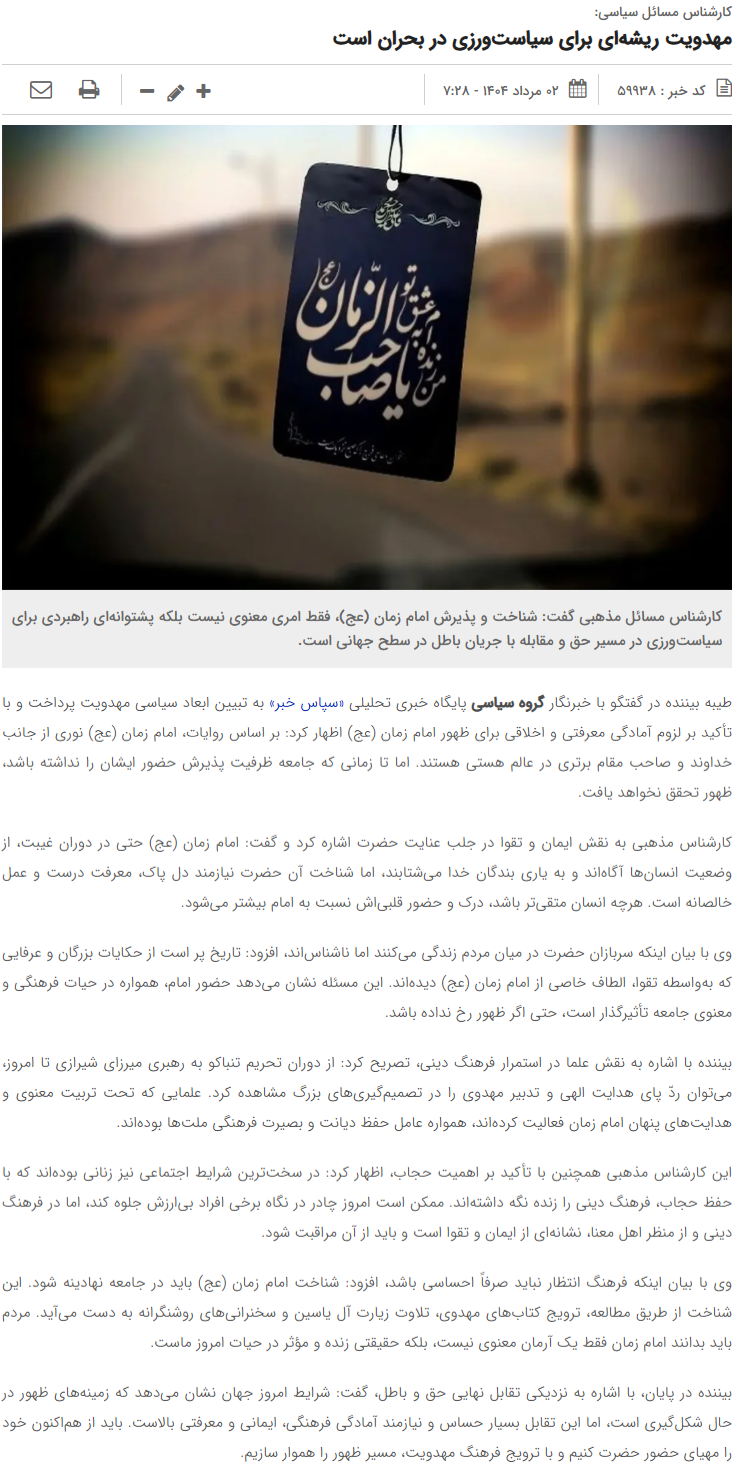 بیننده در پایان، با اشاره به نزدیکی تقابل نهایی حق و باطل، گفت: شرایط امروز جهان نشان میدهد که زمینههای ظهور در حال شکلگیری است، اما این تقابل بسیار حساس و نیازمند آمادگی فرهنگی، ایمانی و معرفتی بالاست. باید از هماکنون خود را مهیای حضور حضرت کنیم و با ترویج فرهنگ مهدویت، مسیر ظهور را هموار سازیم.