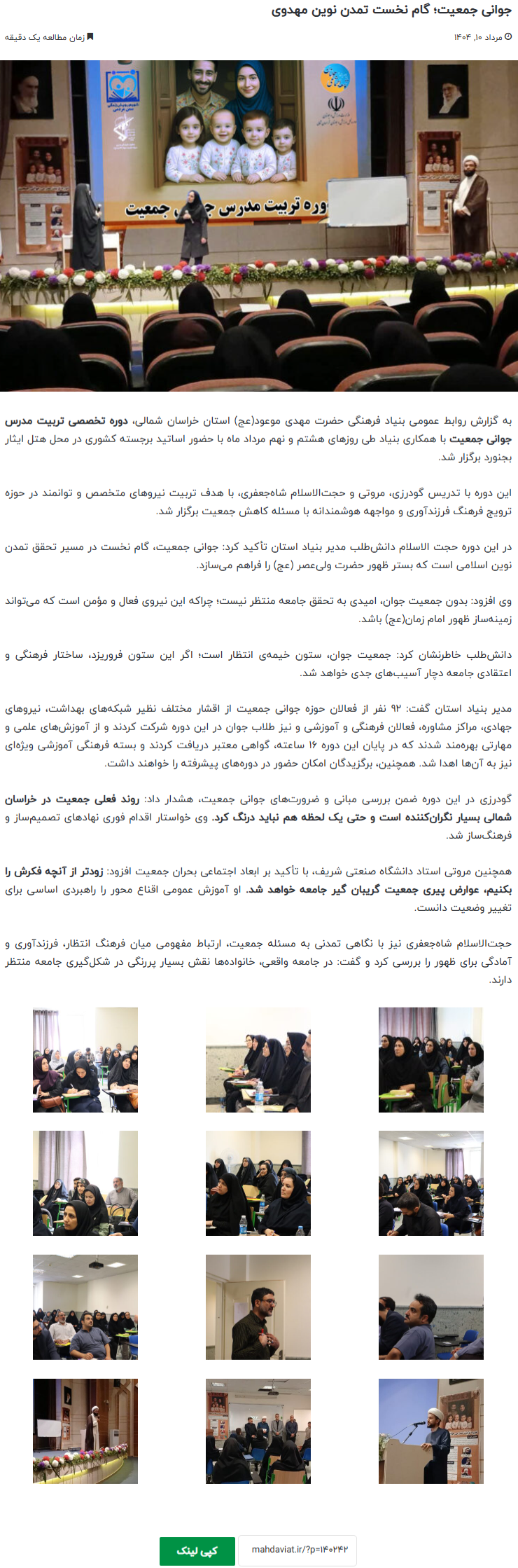 در این دوره حجت الاسلام دانشطلب مدیر بنیاد استان تأکید کرد: جوانی جمعیت، گام نخست در مسیر تحقق تمدن نوین اسلامی است که بستر ظهور حضرت ولیعصر (عج) را فراهم میسازد.