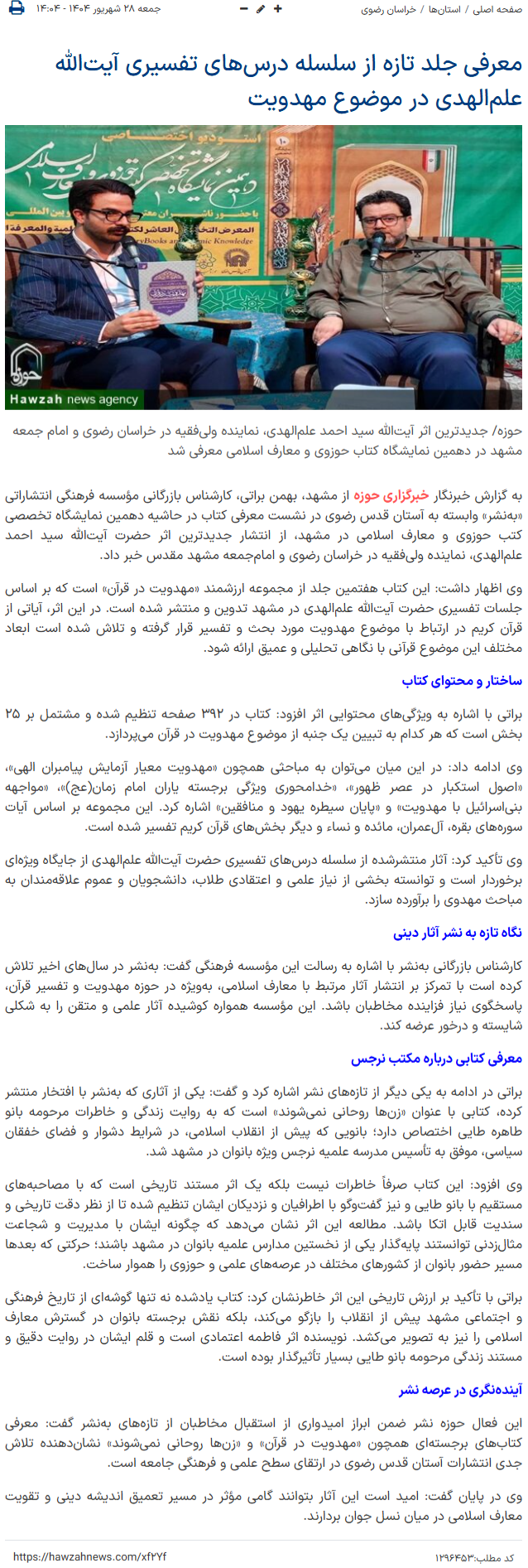 وی تأکید کرد: آثار منتشرشده از سلسله درسهای تفسیری حضرت آیتالله علمالهدی از جایگاه ویژهای برخوردار است و توانسته بخشی از نیاز علمی و اعتقادی طلاب، دانشجویان و عموم علاقهمندان به مباحث مهدوی را برآورده سازد.