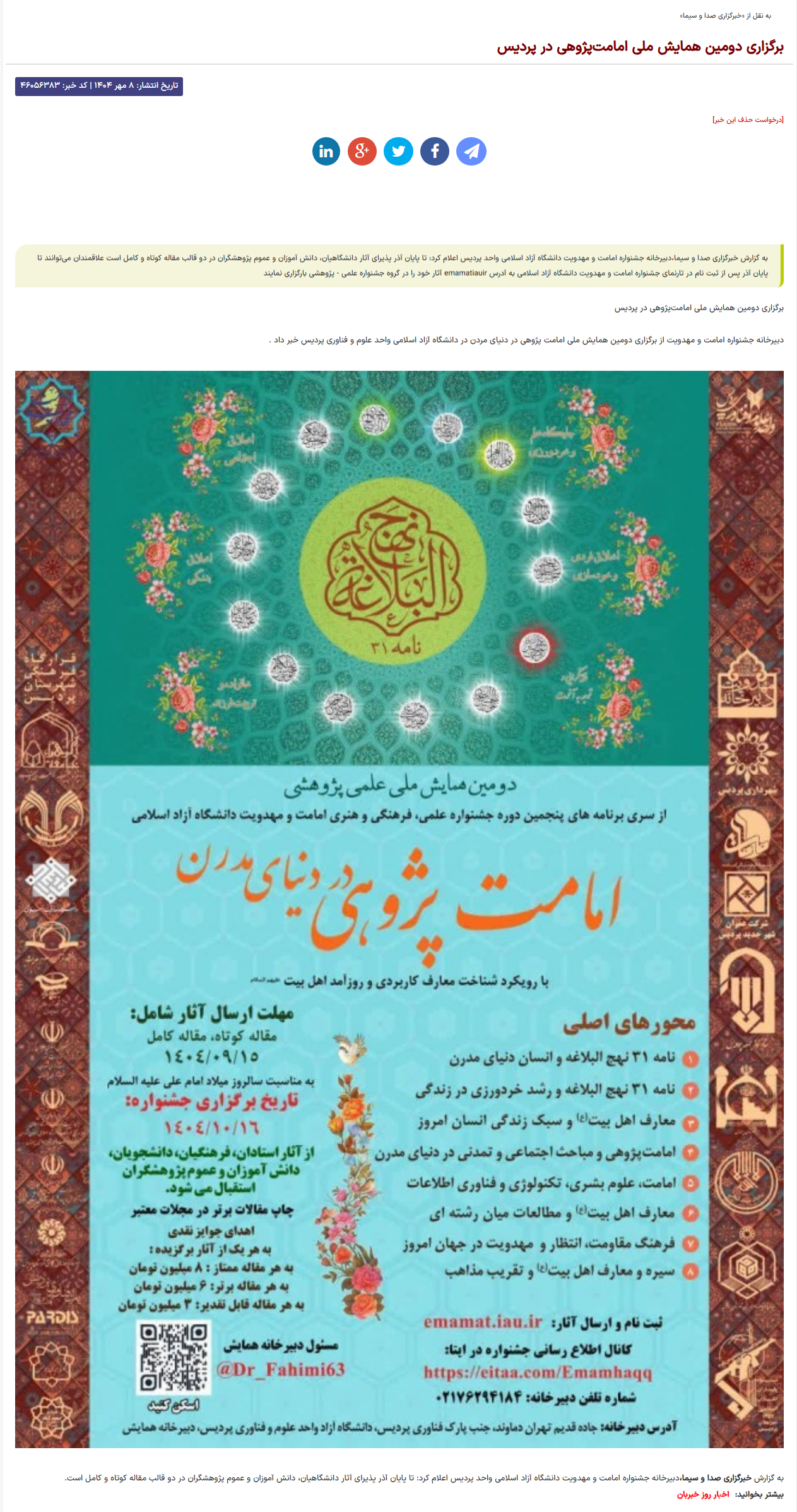 دبیرخانه جشنواره امامت و مهدویت دانشگاه آزاد اسلامی واحد پردیس اعلام کرد: تا پایان آذر پذیرای آثار دانشگاهیان، دانش آموزان و عموم پژوهشگران در دو قالب مقاله کوتاه و کامل است علاقمندان میتوانند تا پایان آذر پس از ثبت نام در تارنمای جشنواره امامت و مهدویت دانشگاه آزاد اسلامی به آدرس emamatiauir آثار خود را در گروه جشنواره علمی - پژوهشی بارگزاری نمایند.
