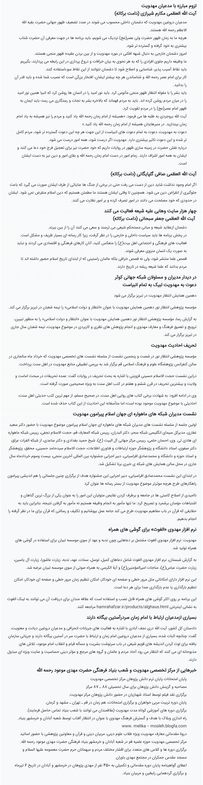 مهدویت: نرم افزار مهدوی الغوث مشتمل بر دعاهایی چون ندبه و عهد از سوی موسسه تبیان برای استفاده در گوشی های همراه تولید شد.