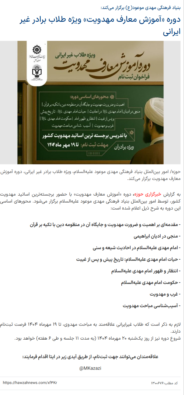 لازم به ذکر است که طلاب غیرایرانی علاقه‌مند به مباحث مهدوی، تا ۱۹ مهرماه ۱۴۰۴ فرصت ثبت‌نام دارند.