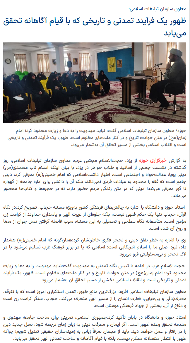 معاون سازمان تبلیغات اسلامی افزود: بزرگترین مانع ظهور، تمدن استکباری امروز است که با تفرقه، مصرفزدگی و بیحیایی، فطرت انسان را از مسیر الهی منحرف میکند. حجاب، سنگر کرامت زن است و دفاع از آن، بخشی از جهاد فرهنگی مومنان است.