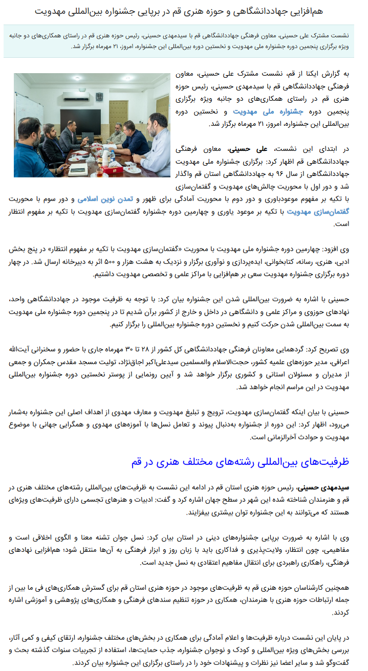 در ابتدای این نشست، علی حسینی، معاون فرهنگی جهاددانشگاهی قم اظهار کرد: برگزاری جشنواره ملی مهدویت جهاددانشگاهی از سال ۹۶ به جهاددانشگاهی استان قم واگذار شد و دور اول با محوریت چالشهای مهدویت و گفتمانسازی با تکیه بر مفهوم موعودباوری و دور دوم با محوریت آمادگی برای ظهور و تمدن نوین اسلامی و دور سوم با محوریت گفتمانسازی مهدویت با تکیه بر موعود یاوری و چهارمین دوره جشنواره گفتمانسازی مهدویت با تکیه بر مفهوم انتظار است.